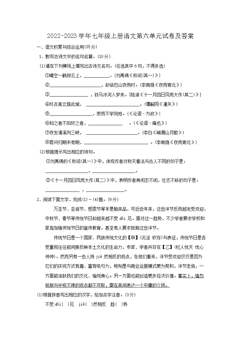 【文檔名稱】 2022-2023學年七年級上冊語文第六單元試卷及答案(Word版).doc