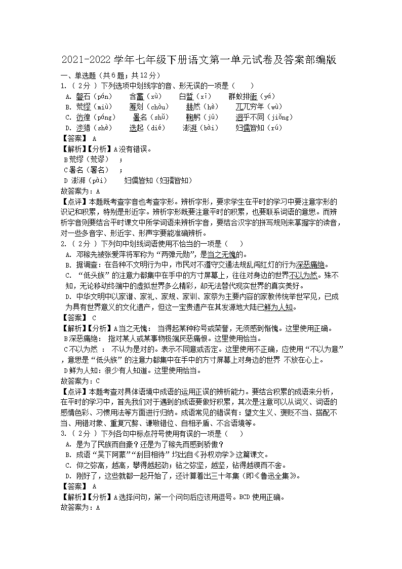 【文檔名稱】 2021-2022學年七年級下冊語文第一單元試卷及答案部編版(Word版).doc