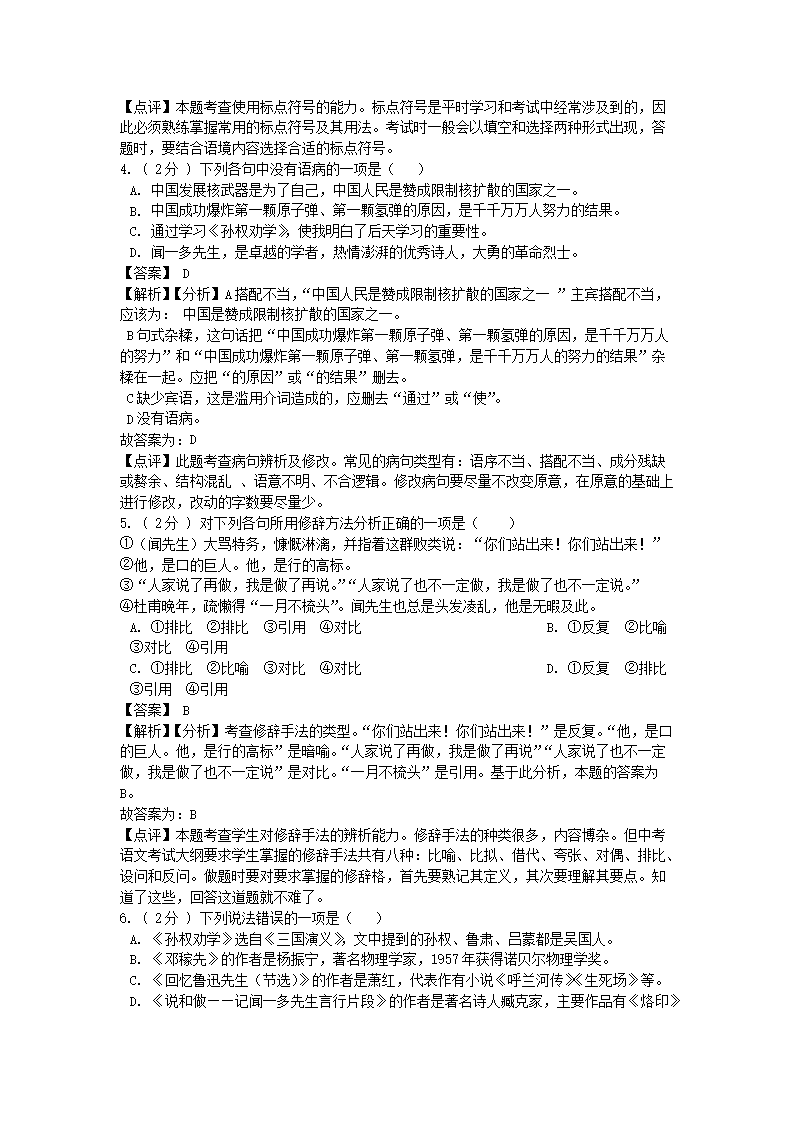 - 2021-2022學年重慶沙坪壩區(qū)七年級下冊語文第一次月考試卷及答案