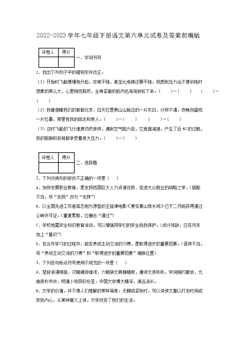 【文檔預覽】 無憂考網(wǎng)整理發(fā)布2022-2023學年七年級下冊語文第六單元試卷及答案部編版(Word版),前五頁預覽如下: