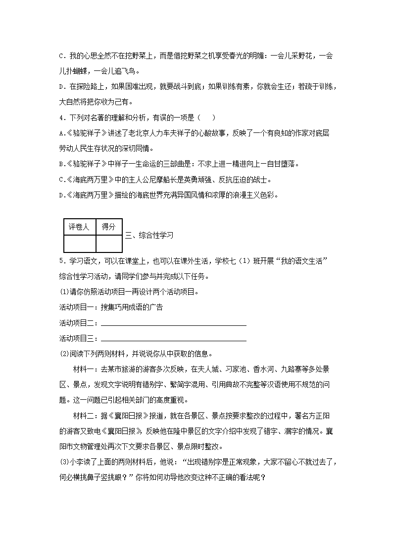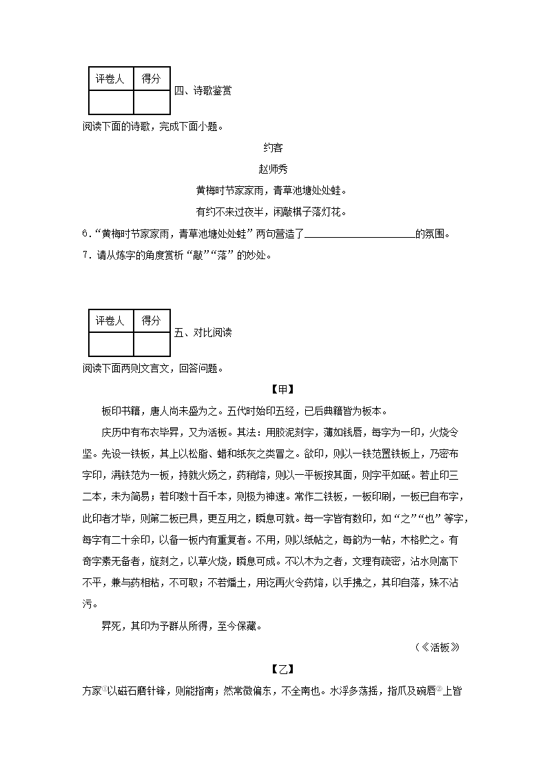 - 2022-2023學年重慶巴南區(qū)七年級下冊語文期末試卷及答案