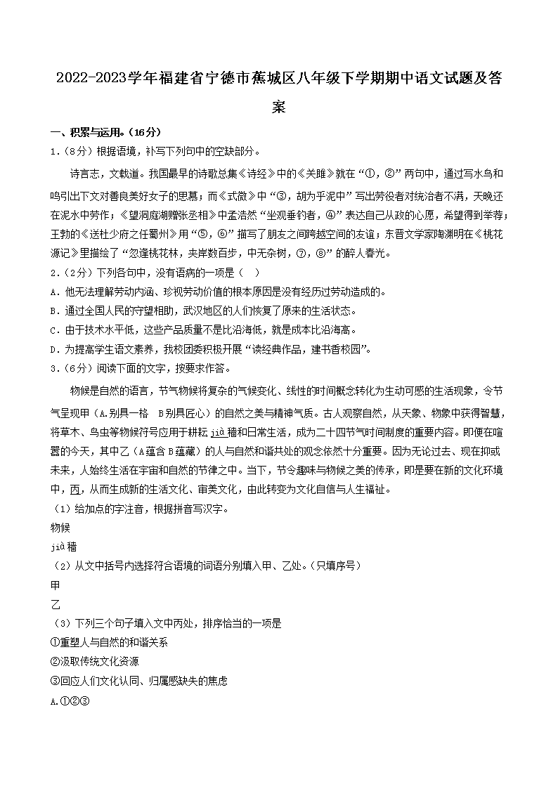 【文檔名稱】 2022-2023學年福建省寧德市蕉城區(qū)八年級下學期期中語文試題及答案(Word版).doc