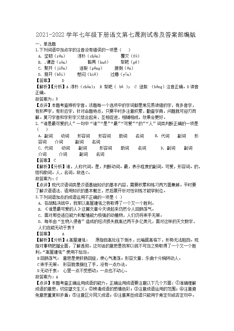 【文檔名稱】 2021-2022學年七年級下冊語文第七課測試卷及答案部編版(Word版).doc