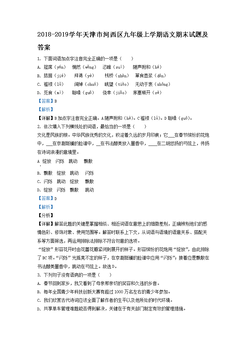 2018-2019學(xué)年天津市河西區(qū)九年級上學(xué)期語文期末試題及答案(Word版)