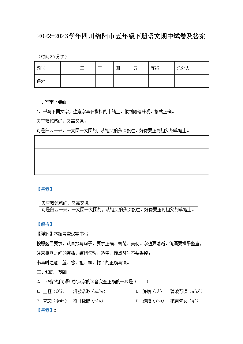 【文檔名稱】 2022-2023學(xué)年四川綿陽市五年級(jí)下冊語文期中試卷及答案(Word版).doc