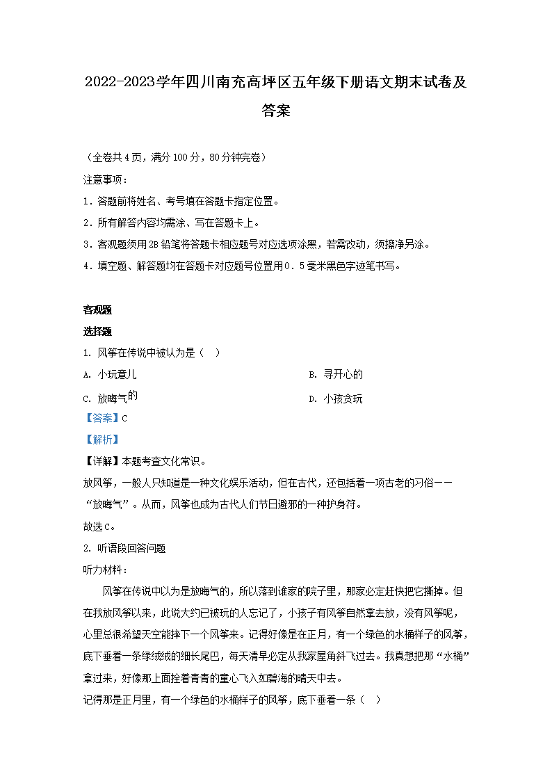 【文檔預(yù)覽】 無(wú)憂考網(wǎng)整理發(fā)布2022-2023學(xué)年四川南充高坪區(qū)五年級(jí)下冊(cè)語(yǔ)文期末試卷及答案(Word版),前五頁(yè)預(yù)覽如下: