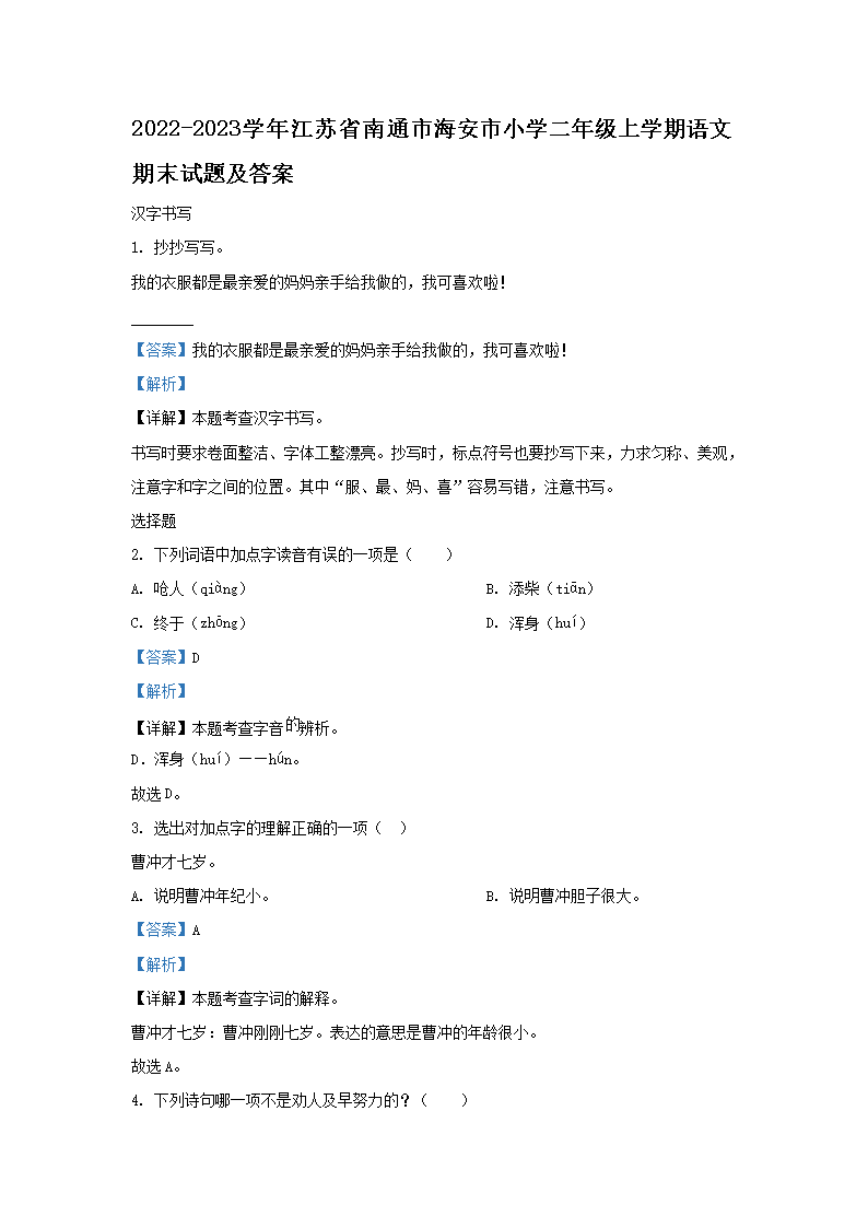 時間:2024-10-31 09:04:00 來源:無憂考網(wǎng) [字體:小 中 大]【文檔名稱】 2022-2023學(xué)年江蘇省南通市海安市小學(xué)二年級上學(xué)期語文期末試題及答案(Word版).doc