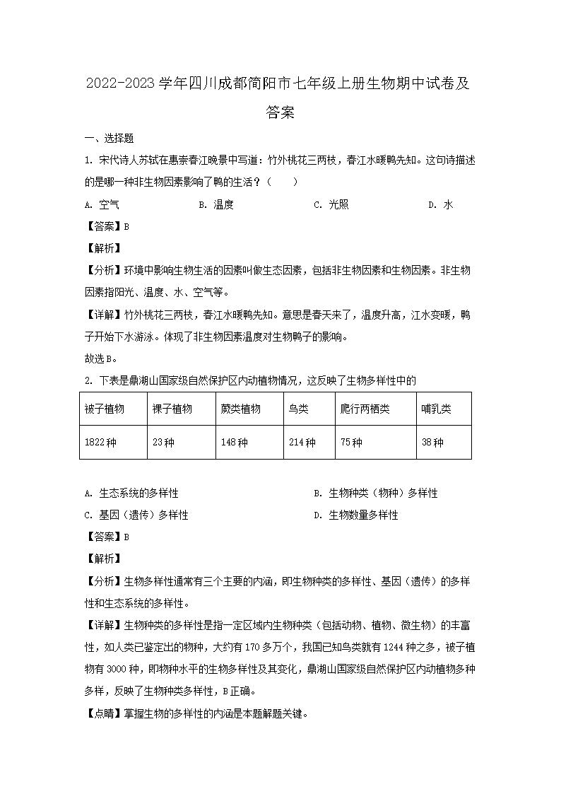 【文檔預(yù)覽】 無憂考網(wǎng)整理發(fā)布2022-2023學(xué)年四川成都簡陽市七年級上冊生物期中試卷及答案(Word版),前五頁預(yù)覽如下: