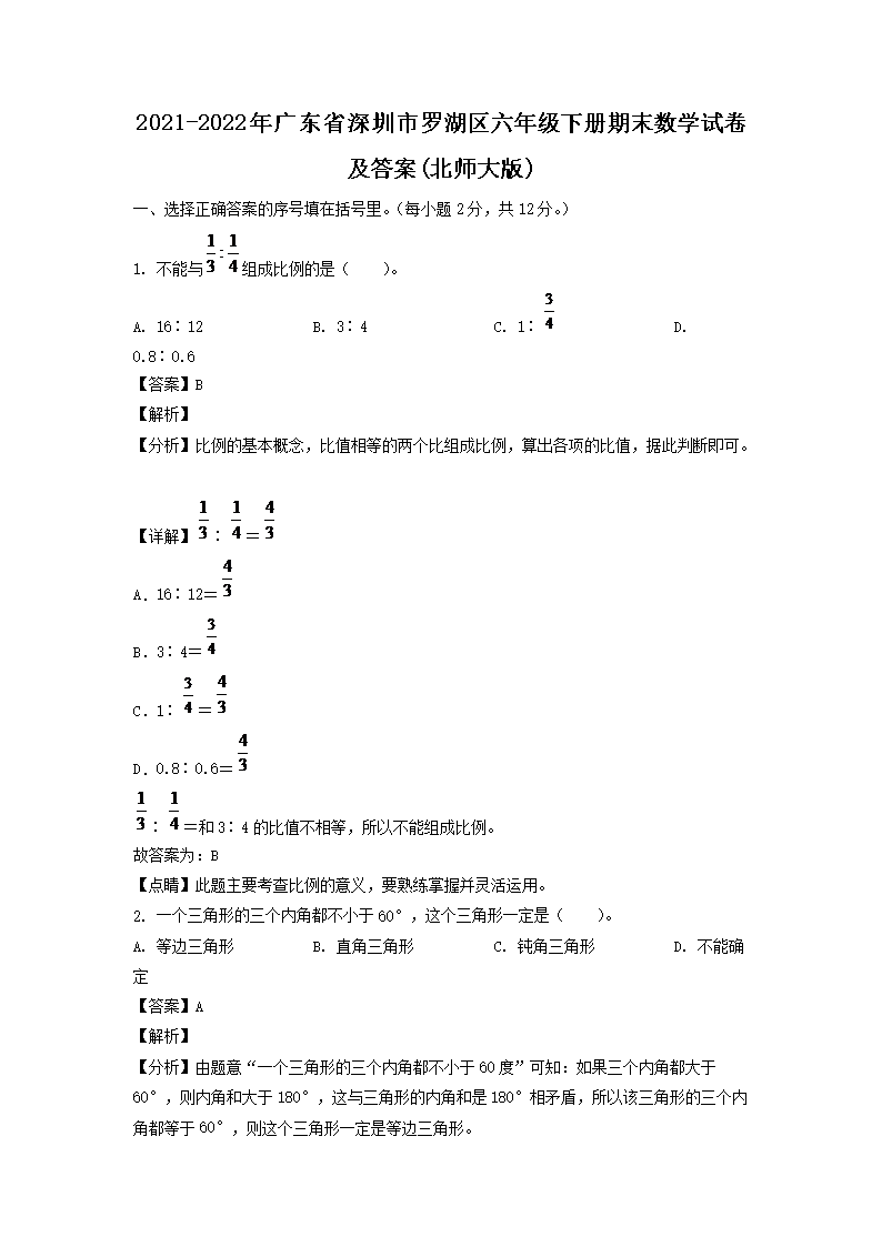 2021-2022年廣東深圳市羅湖區(qū)六年級(jí)下冊(cè)期末數(shù)學(xué)試卷及答案(北師大版)(Word版)