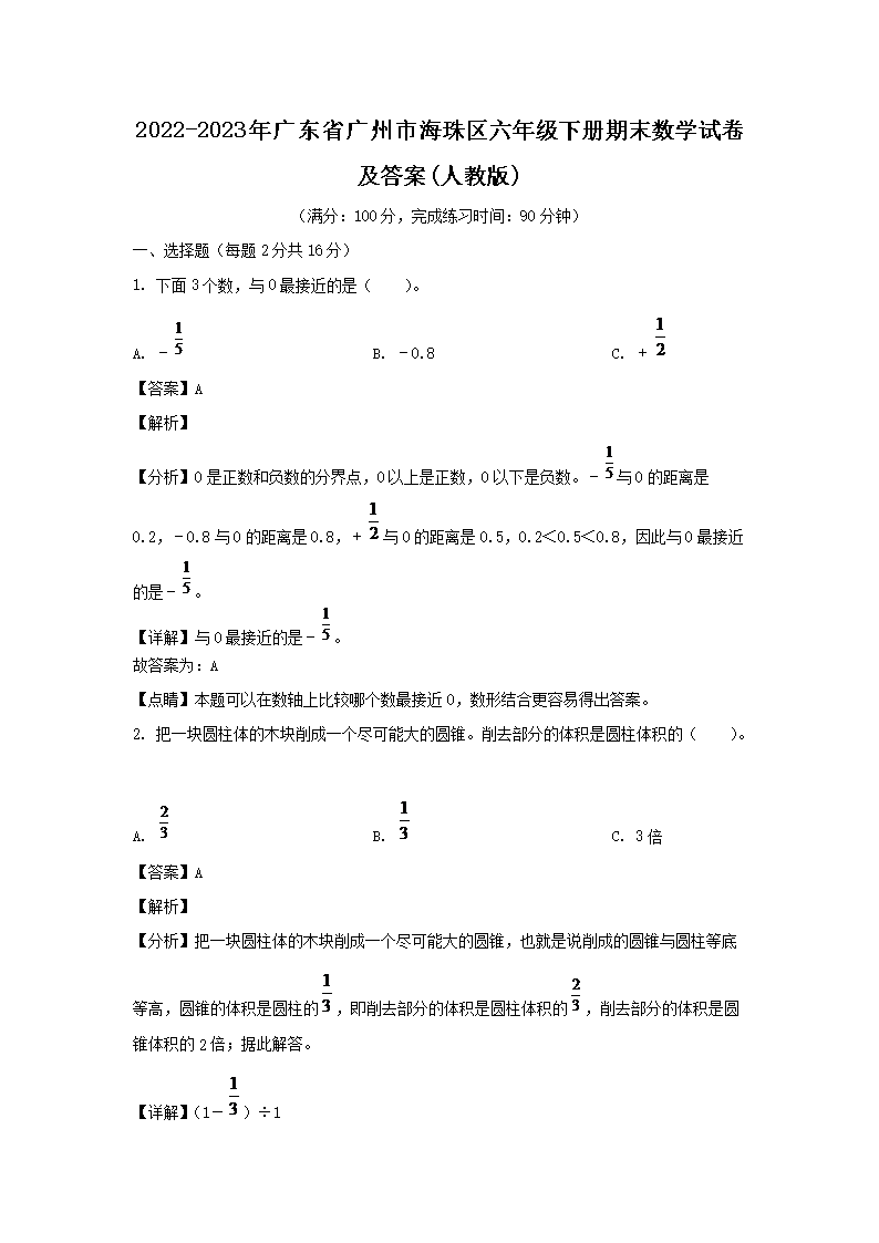 2022-2023年廣東省廣州市海珠區(qū)六年級下冊期末數(shù)學(xué)試卷及答案(人教版)(Word版)