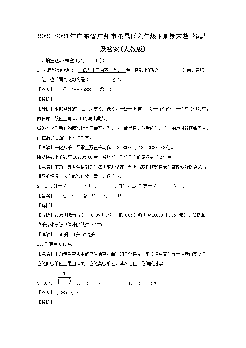 時間:2025-02-11 17:54:00 來源:無憂考網(wǎng) [字體:小 中 大]【文檔名稱】 2020-2021年廣東省廣州市番禺區(qū)六年級下冊期末數(shù)學(xué)試卷及答案(人教版)(Word版).doc