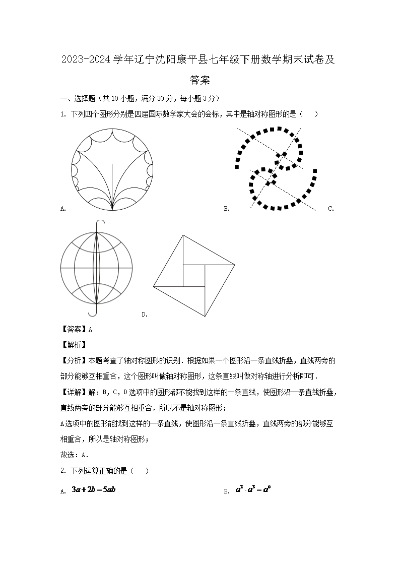 【文檔預(yù)覽】 無憂考網(wǎng)整理發(fā)布2023-2024學(xué)年遼寧沈陽康平縣七年級下冊數(shù)學(xué)期末試卷及答案(Word版),前五頁預(yù)覽如下: