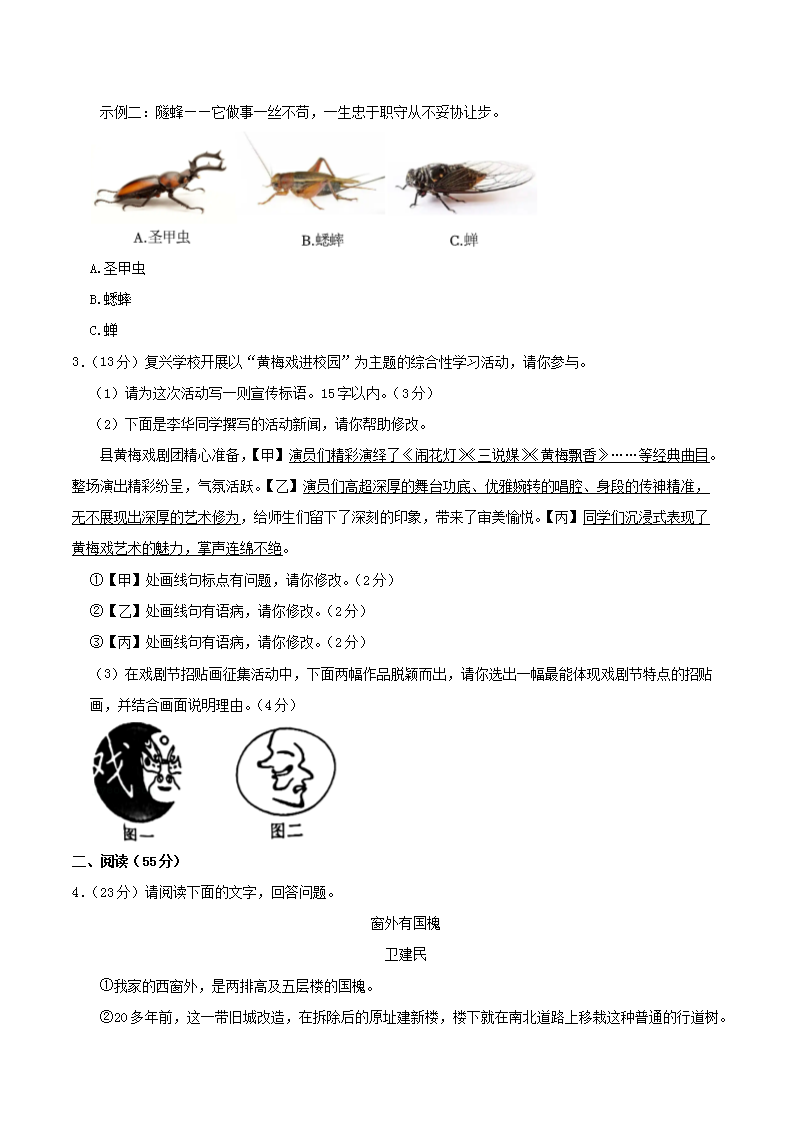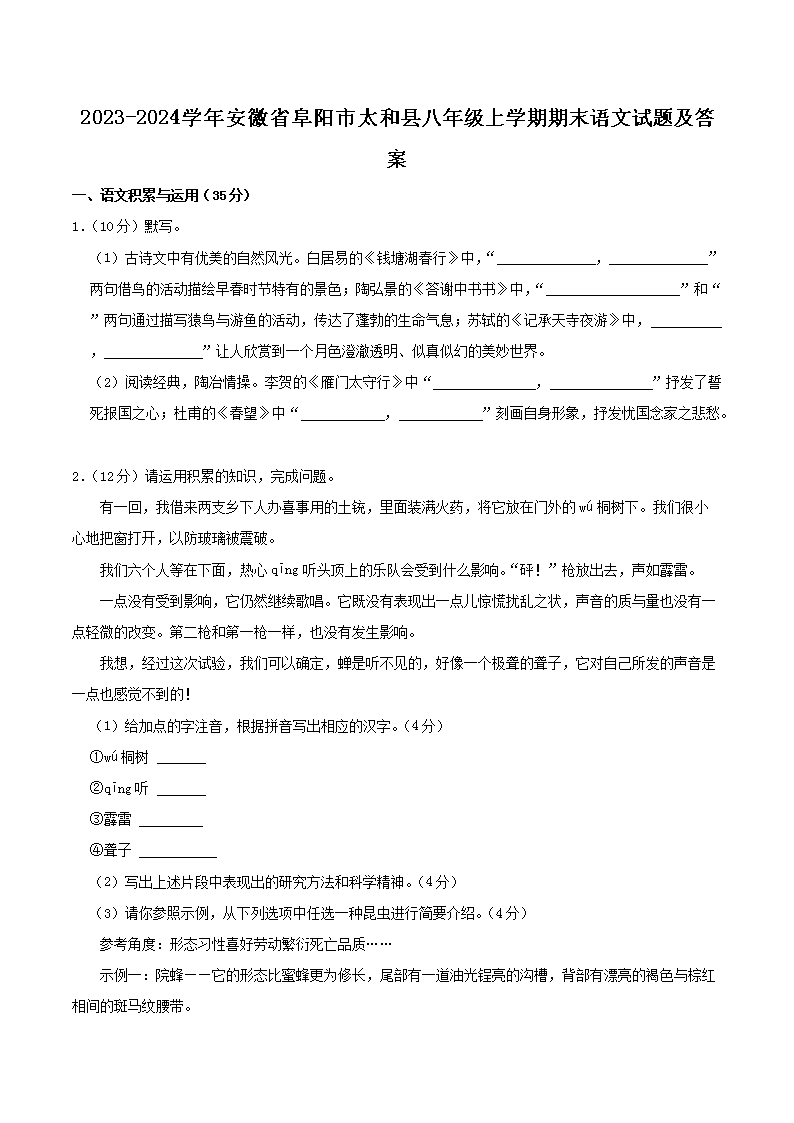 2023-2024學(xué)年安徽省阜陽市太和縣八年級上學(xué)期期末語文試題及答案(Word版)