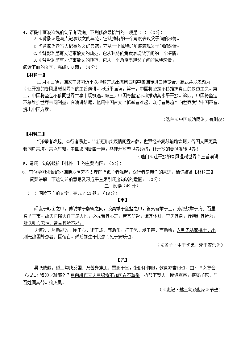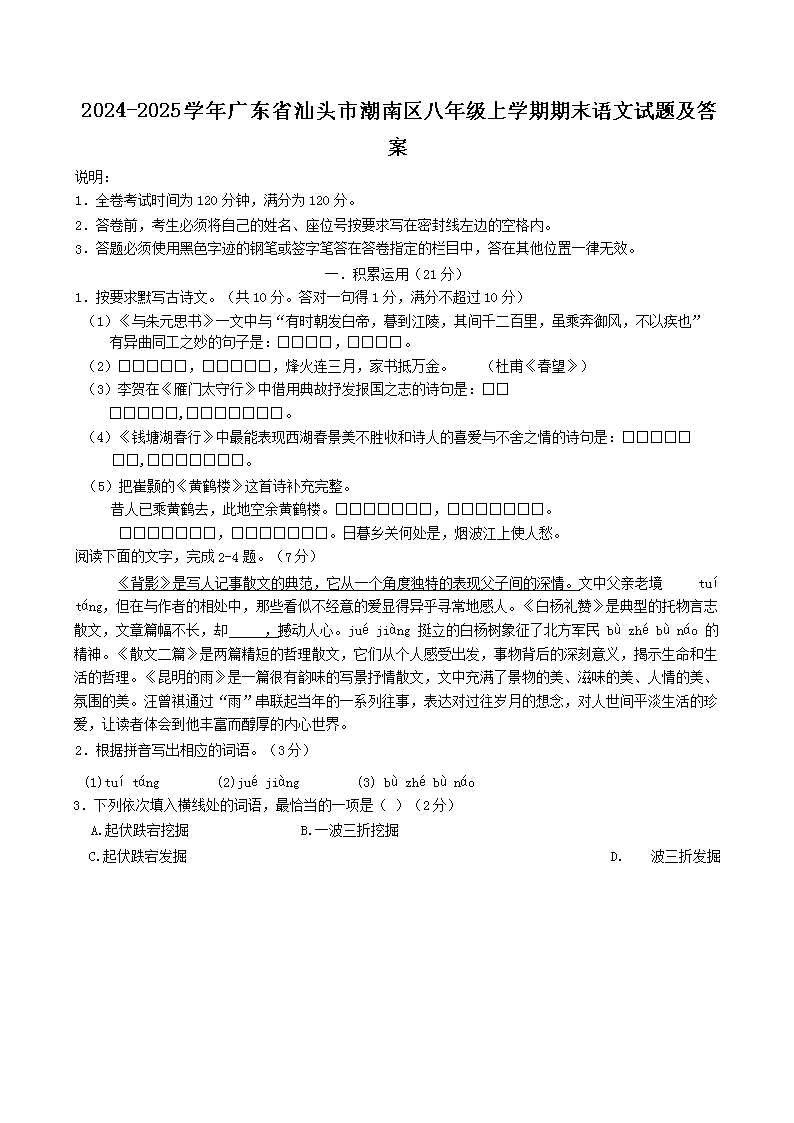 時間:2025-02-25 16:52:00 來源:無憂考網(wǎng) [字體:小 中 大]【文檔名稱】 2024-2025學(xué)年廣東省汕頭市潮南區(qū)八年級上學(xué)期期末語文試題及答案(Word版).doc