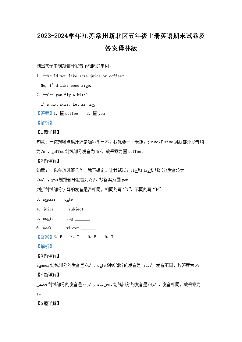 【文檔名稱】 2023-2024學年江蘇常州新北區(qū)五年級上冊英語期末試卷及答案譯林版(Word版).doc