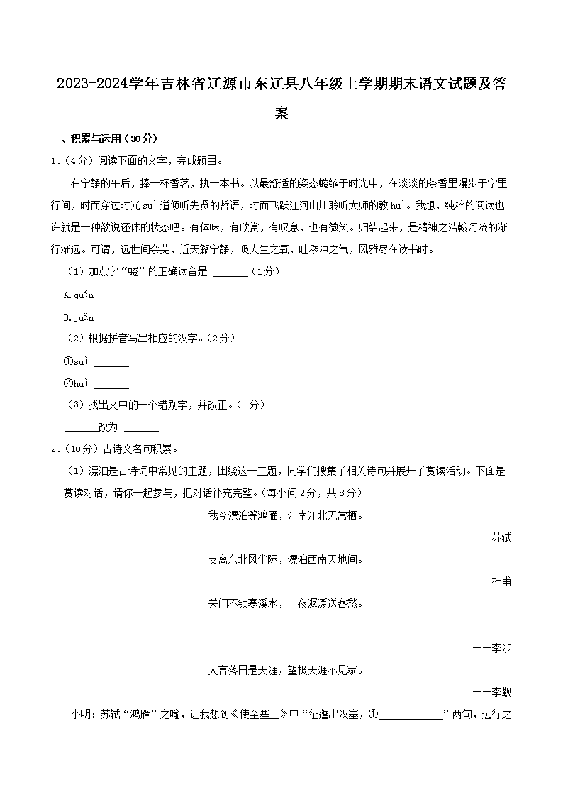 2023-2024學(xué)年吉林省遼源市東遼縣八年級(jí)上學(xué)期期末語(yǔ)文試題及答案(Word版)