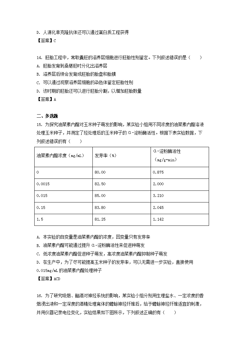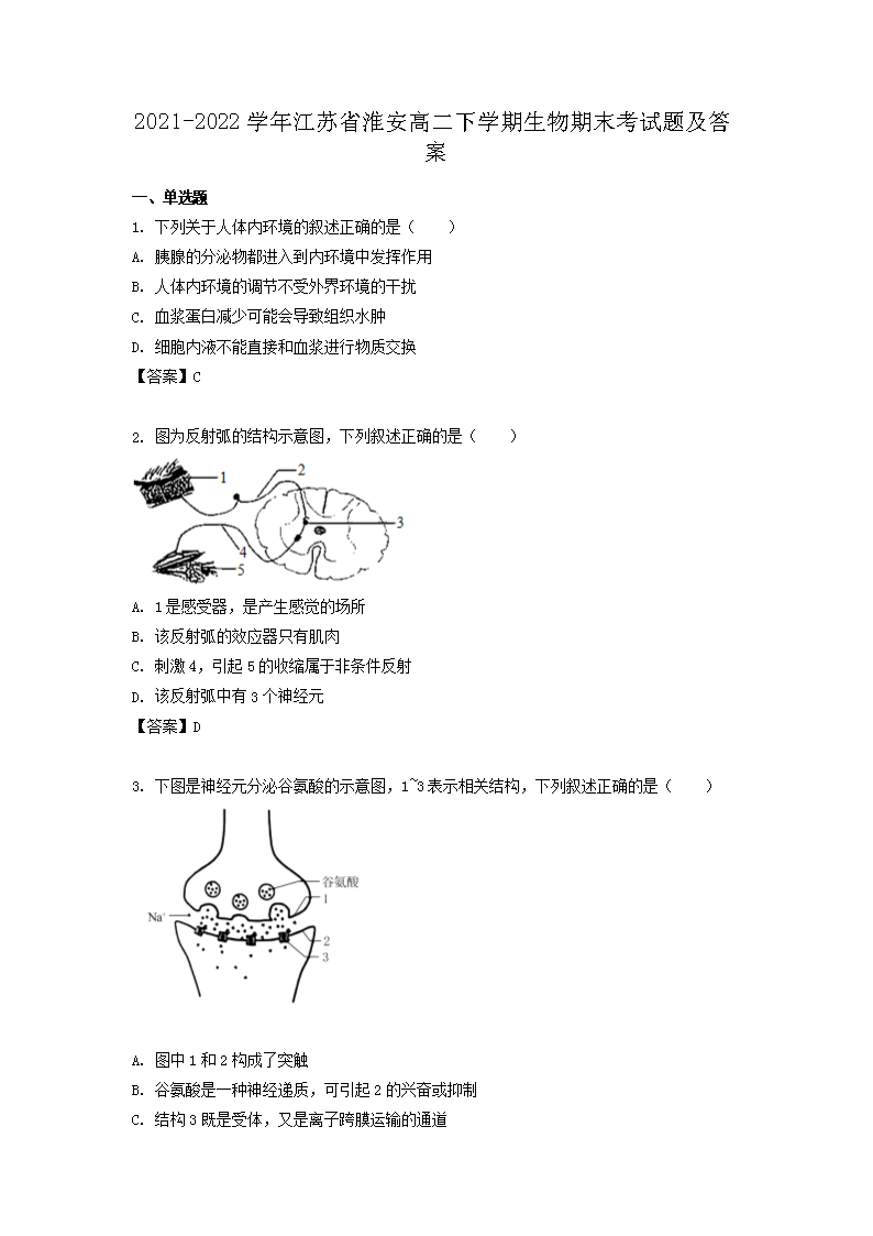 【文檔名稱】 2021-2022學(xué)年江蘇省淮安高二下學(xué)期生物期末考試題及答案(Word版).doc