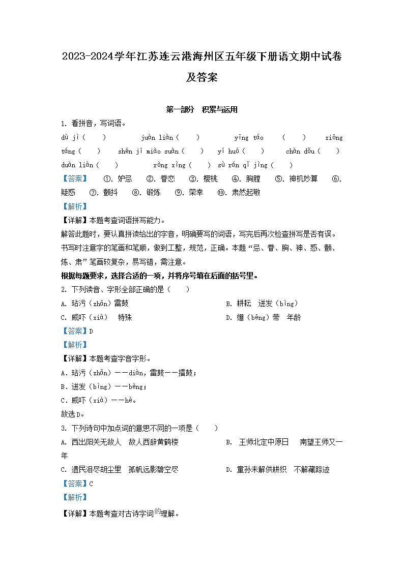 【文檔名稱】 2023-2024學年江蘇連云港海州區(qū)五年級下冊語文期中試卷及答案(Word版).doc