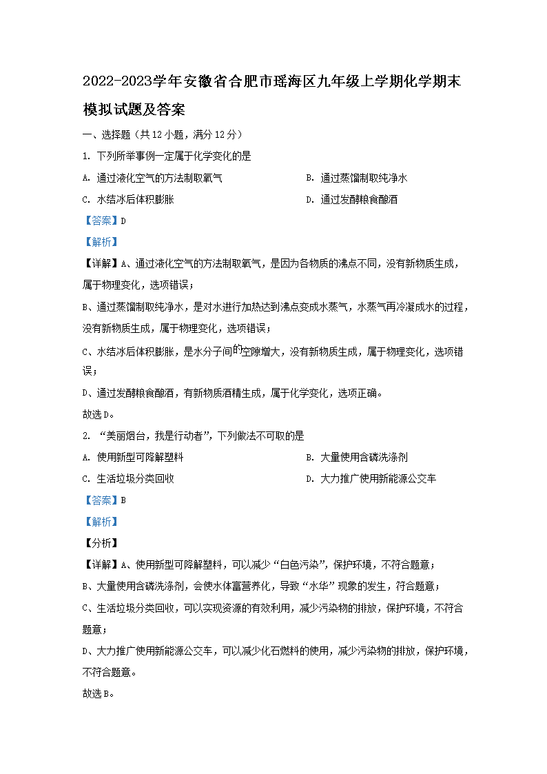【文檔預覽】 無憂考網整理發(fā)布2022-2023學年安徽省合肥市瑤海區(qū)九年級上學期化學期末模擬試題及答案(Word版),前五頁預覽如下: