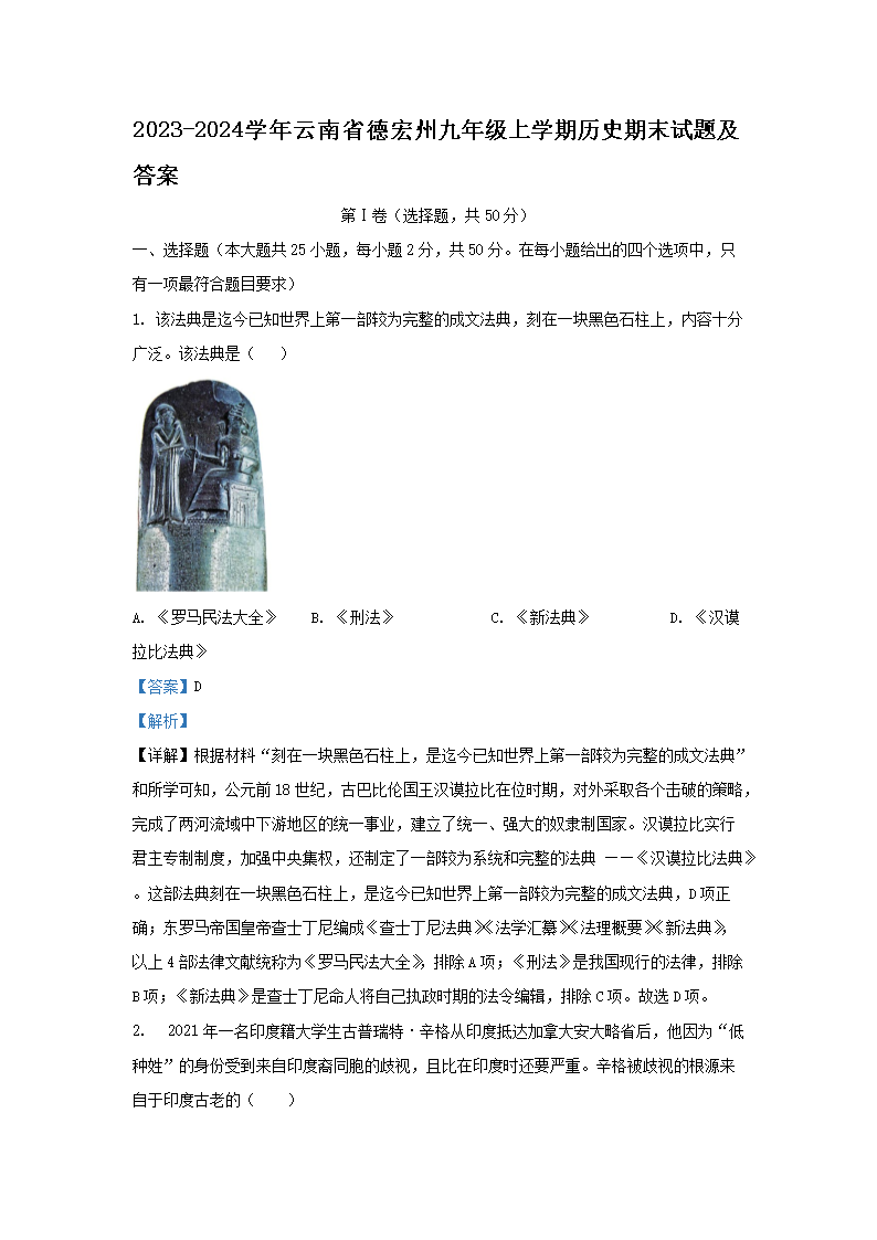 2023-2024學(xué)年云南省德宏州九年級(jí)上學(xué)期歷史期末試題及答案(Word版)