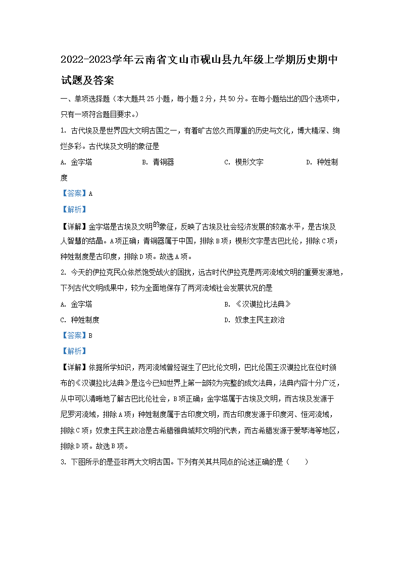 時間:2025-03-24 12:57:00 來源:無憂考網(wǎng) [字體:小 中 大]【文檔名稱】 2022-2023學(xué)年云南省文山市硯山縣九年級上學(xué)期歷史期中試題及答案(Word版).doc