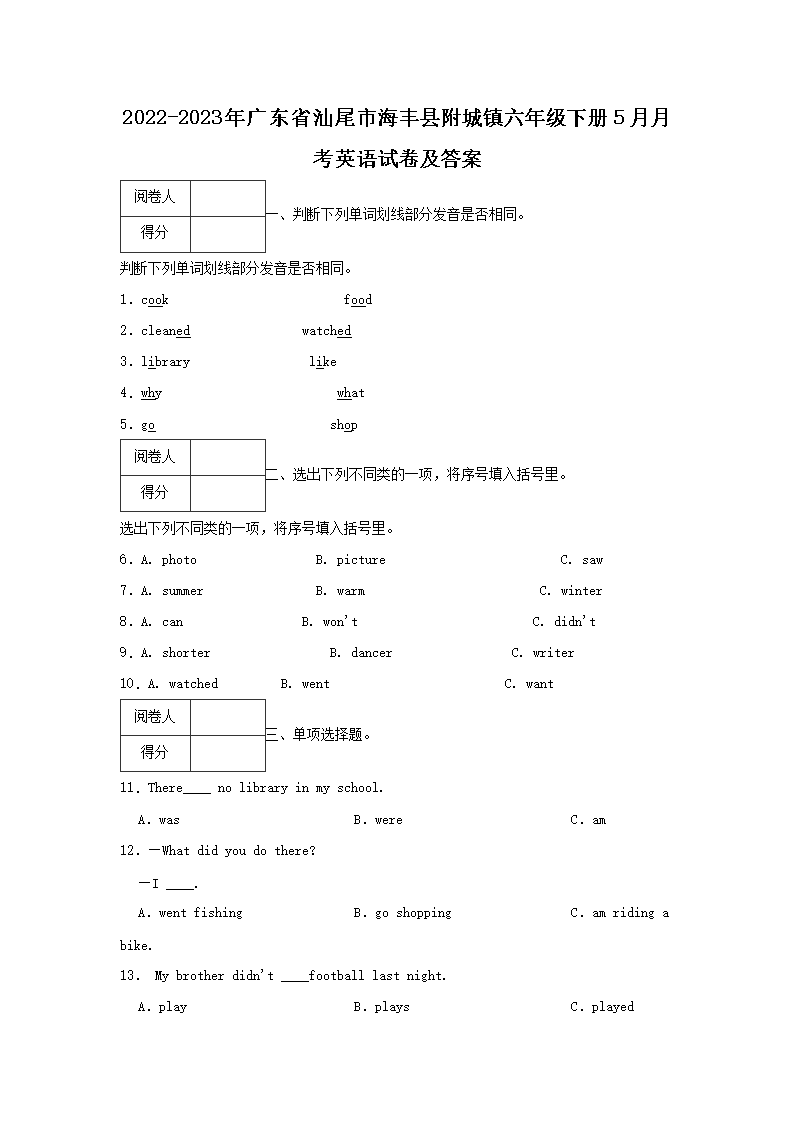 2022-2023年廣東省汕尾市海豐縣附城鎮(zhèn)六年級(jí)下冊(cè)5月月考英語(yǔ)試卷及答案(Word版)