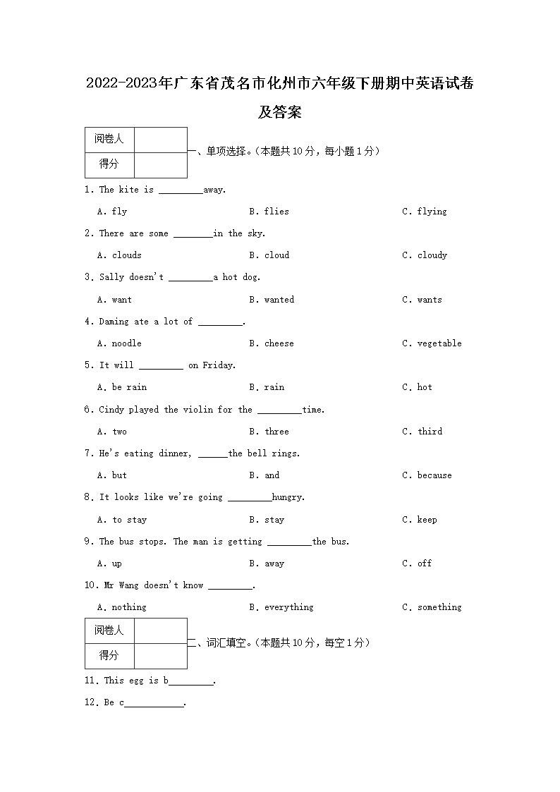【文檔名稱】 2022-2023年廣東省茂名市化州市六年級下冊期中英語試卷及答案(Word版).doc