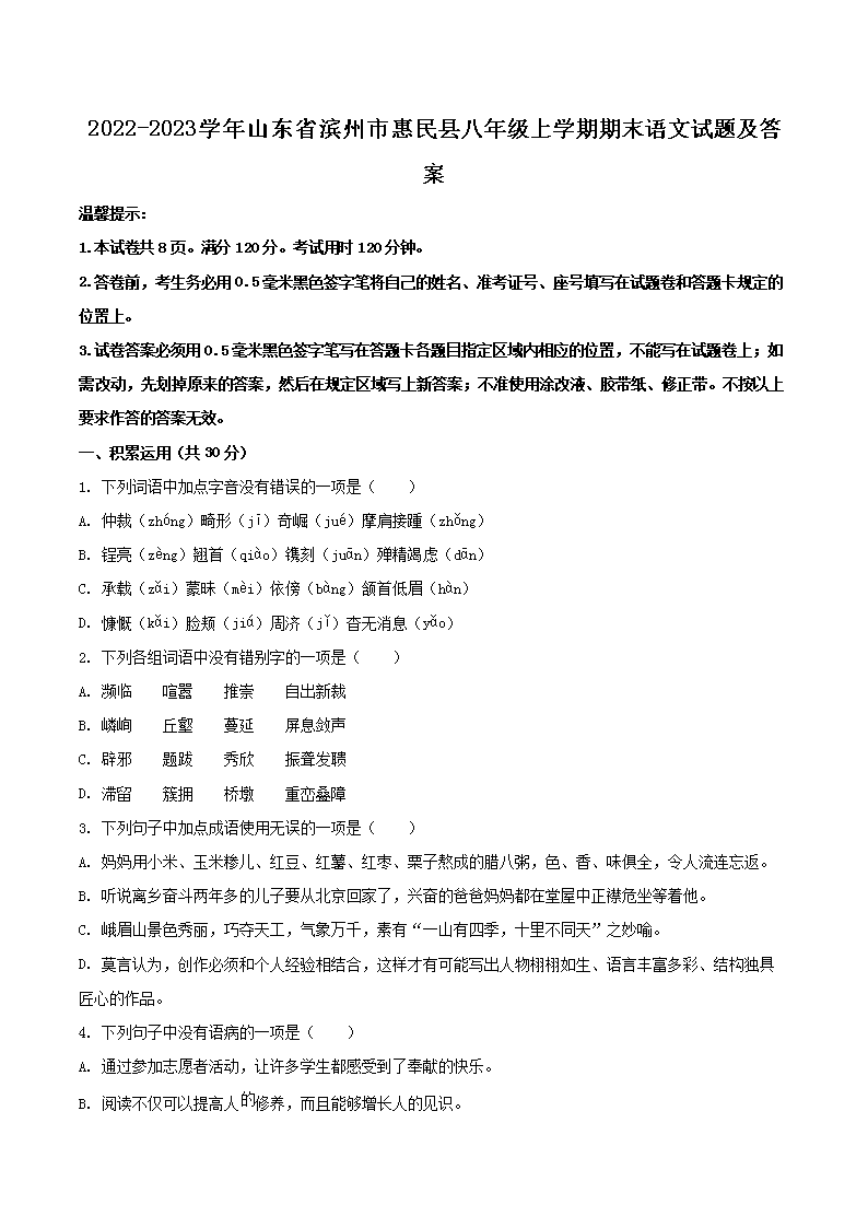 2022-2023學(xué)年山東省濱州市惠民縣八年級上學(xué)期期末語文試題及答案(Word版)