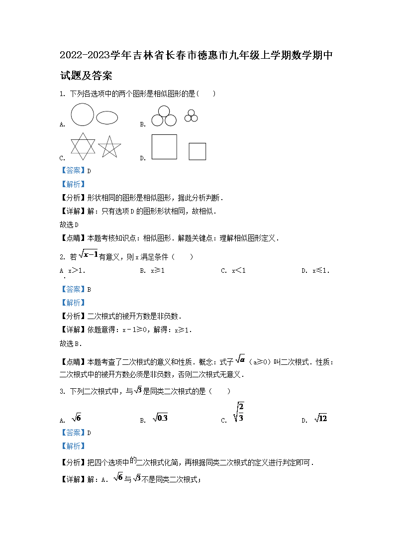 時間:2025-03-28 11:34:00 來源:無憂考網(wǎng) [字體:小 中 大]【文檔名稱】 2022-2023學(xué)年吉林省長春市德惠市九年級上學(xué)期數(shù)學(xué)期中試題及答案(Word版).doc