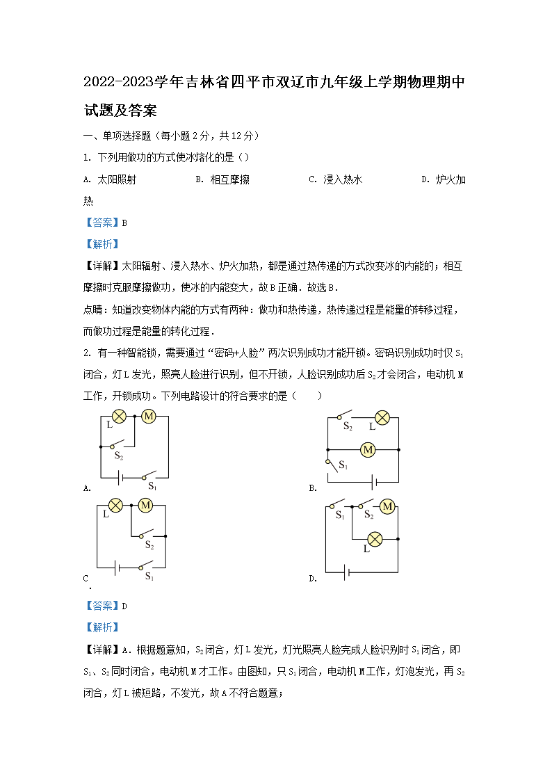 時(shí)間:2025-03-31 11:52:00 來(lái)源:無(wú)憂考網(wǎng) [字體:小 中 大]【文檔名稱】 2022-2023學(xué)年吉林省四平市雙遼市九年級(jí)上學(xué)期物理期中試題及答案(Word版).doc