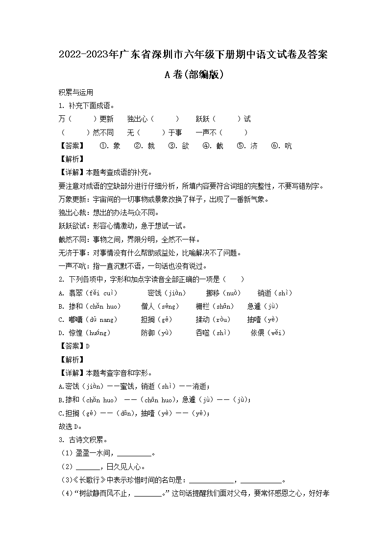 【文檔名稱】 2022-2023年廣東省深圳市六年級下冊期中語文試卷及答案A卷(部編版)(Word版).doc