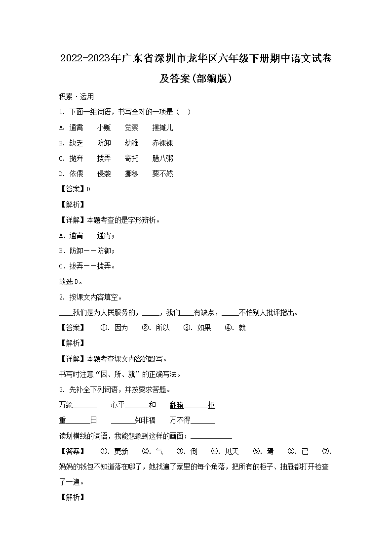 2022-2023年廣東深圳市龍華區(qū)六年級(jí)下冊(cè)期中語(yǔ)文試卷及答案(部編版)(Word版)