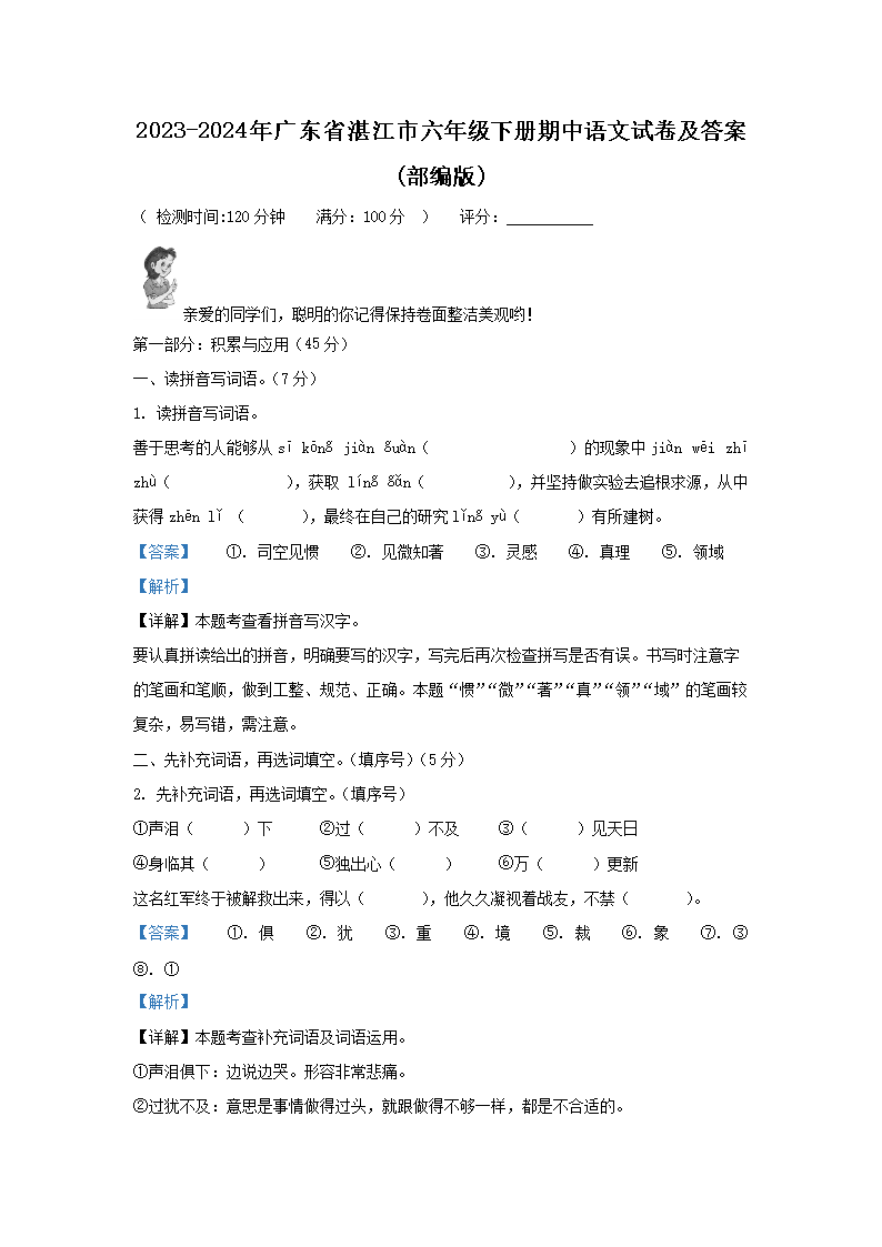 【文檔名稱】 2023-2024年廣東省湛江市六年級下冊期中語文試卷及答案(部編版)(Word版).doc