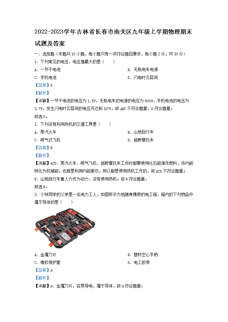 【文檔預(yù)覽】 無憂考網(wǎng)整理發(fā)布2022-2023學(xué)年吉林省長(zhǎng)春市南關(guān)區(qū)九年級(jí)上學(xué)期物理期末試題及答案(Word版),前五頁(yè)預(yù)覽如下: