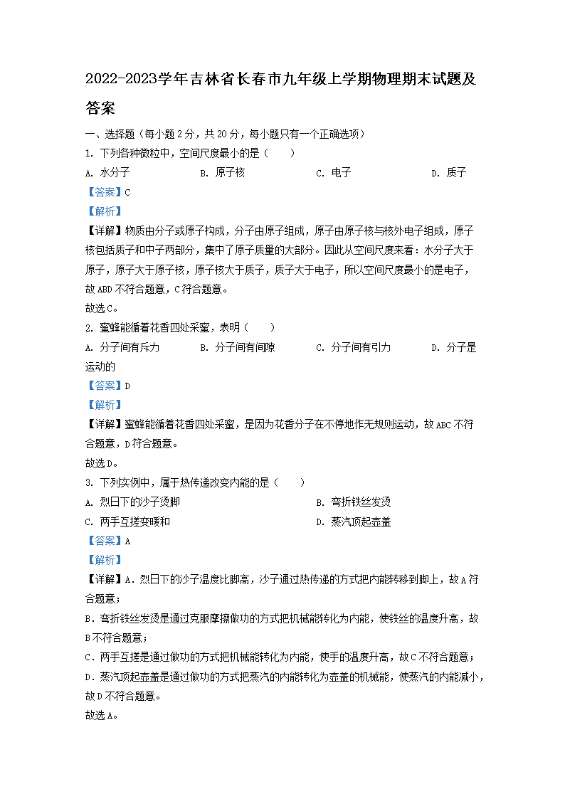 2022-2023學(xué)年吉林省長春市九年級上學(xué)期物理期末試題及答案(Word版)