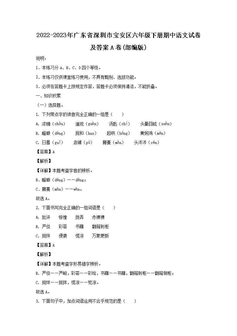 【文檔預(yù)覽】 無憂考網(wǎng)整理發(fā)布2022-2023年廣東省深圳市寶安區(qū)六年級下冊期中語文試卷及答案A卷(部編版)(Word版),前五頁預(yù)覽如下:
