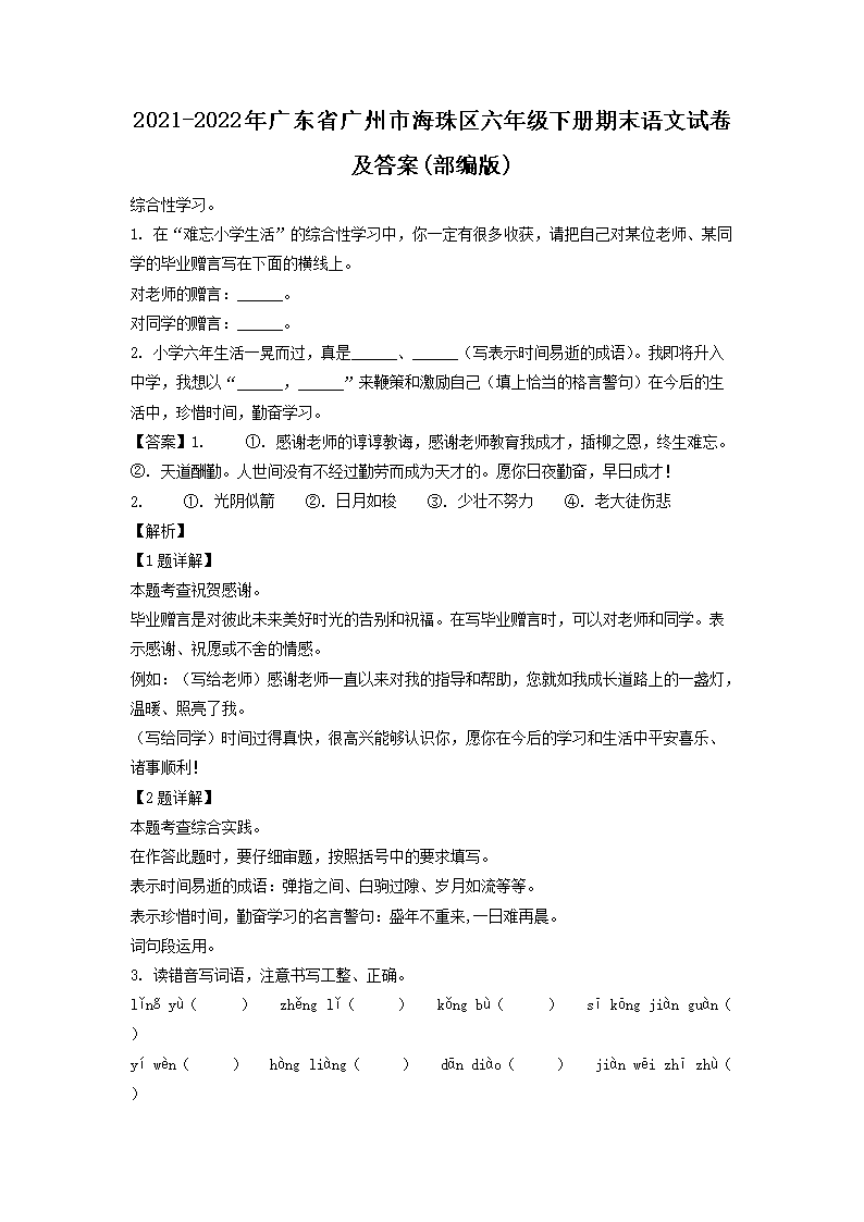 2021-2022年廣東省廣州市海珠區(qū)六年級(jí)下冊(cè)期末語(yǔ)文試卷及答案(部編版)(Word版)