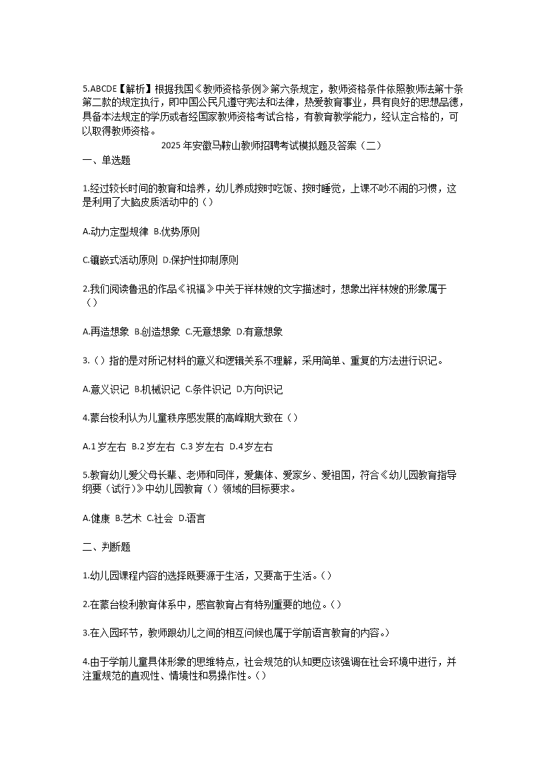 【文檔預(yù)覽】 無憂考網(wǎng)整理發(fā)布2025年安徽馬鞍山教師招聘考試模擬試題及答案(Word版),前五頁預(yù)覽如下: