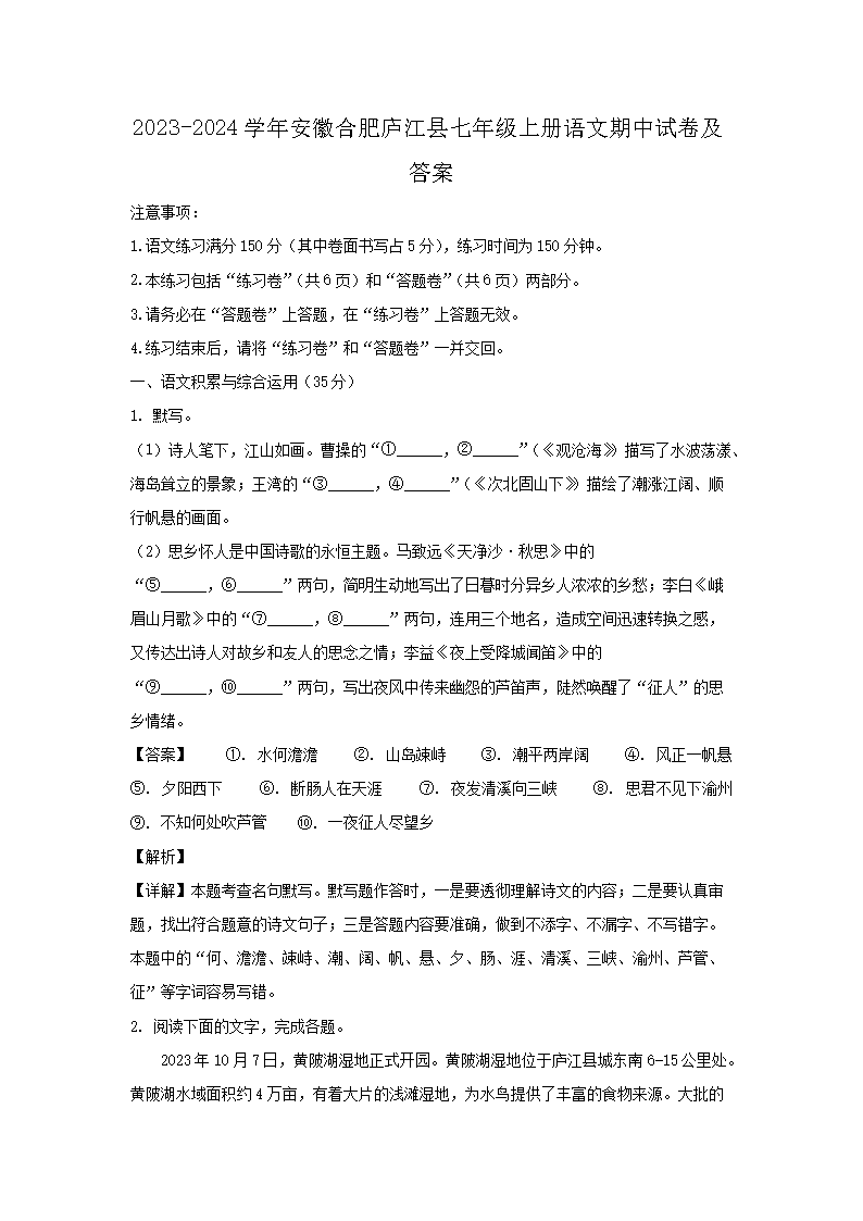 2023-2024學(xué)年安徽合肥廬江縣七年級(jí)上冊(cè)語文期中試卷及答案(Word版)