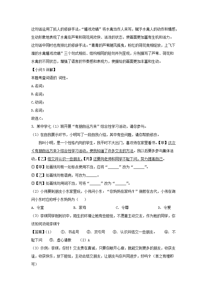 - 2021-2022學(xué)年重慶沙坪壩區(qū)七年級(jí)下冊(cè)語文第一次月考試卷及答案