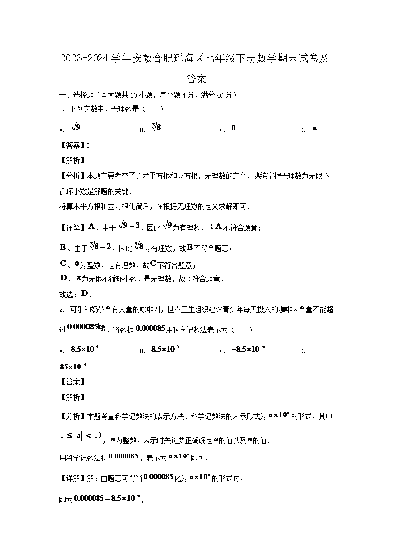 【文檔預(yù)覽】 無憂考網(wǎng)整理發(fā)布2023-2024學(xué)年安徽合肥瑤海區(qū)七年級下冊數(shù)學(xué)期末試卷及答案(Word版),前五頁預(yù)覽如下: