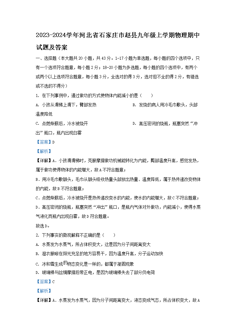 2023-2024學(xué)年河北省石家莊市趙縣九年級上學(xué)期物理期中試題及答案(Word版)