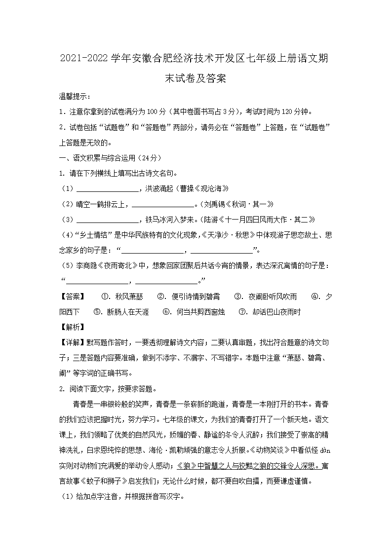 2021-2022學(xué)年安徽合肥經(jīng)濟(jì)技術(shù)開發(fā)區(qū)七年級(jí)上冊(cè)語(yǔ)文期末試卷及答案(Word版)