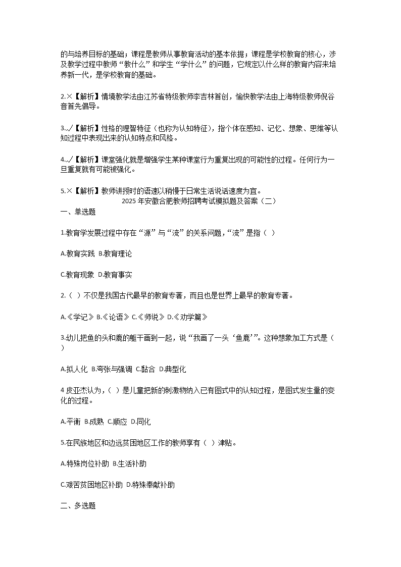 【文檔名稱】 2025年安徽合肥教師招聘考試模擬試題及答案(Word版).doc