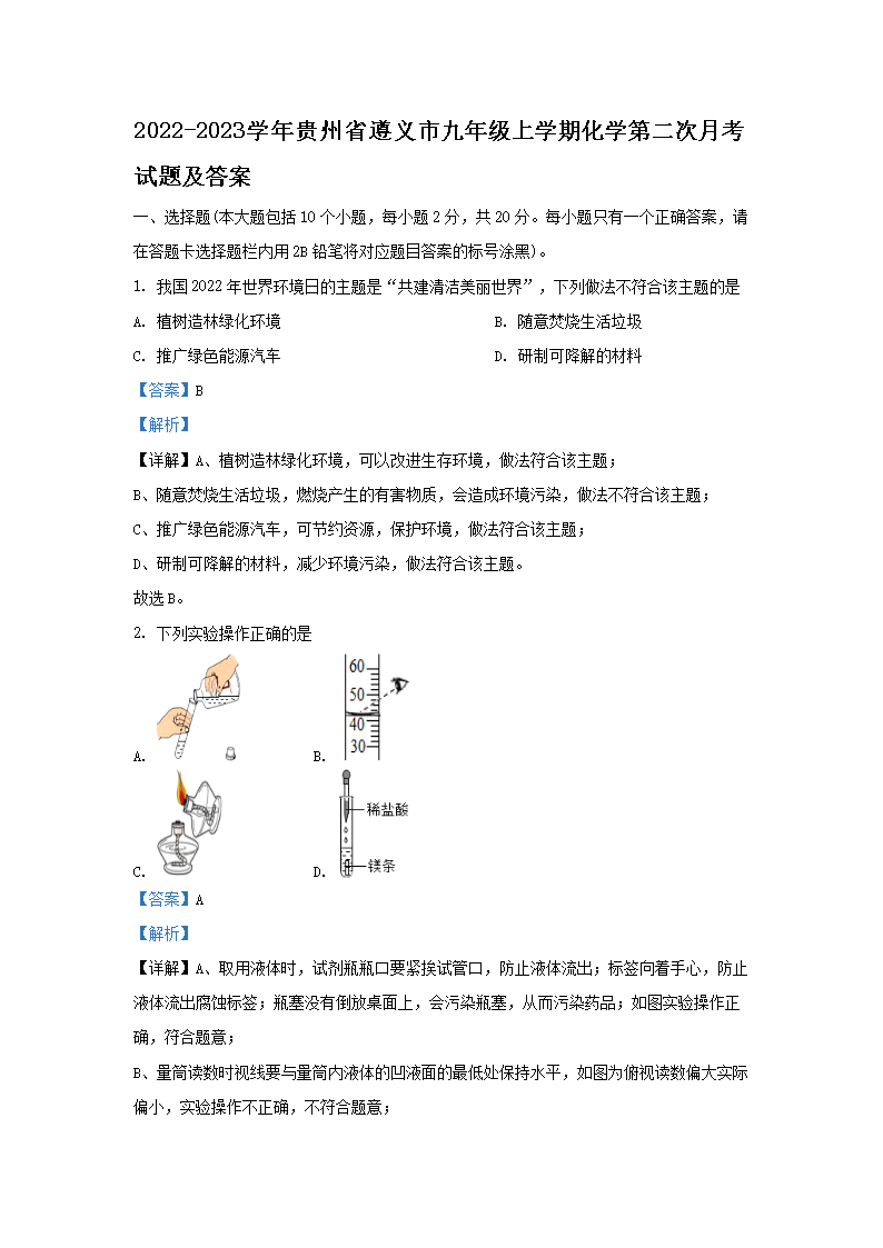 【文檔預(yù)覽】 無(wú)憂考網(wǎng)整理發(fā)布2022-2023學(xué)年貴州省遵義市九年級(jí)上學(xué)期化學(xué)第二次月考試題及答案(Word版),前五頁(yè)預(yù)覽如下: