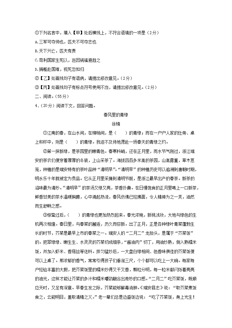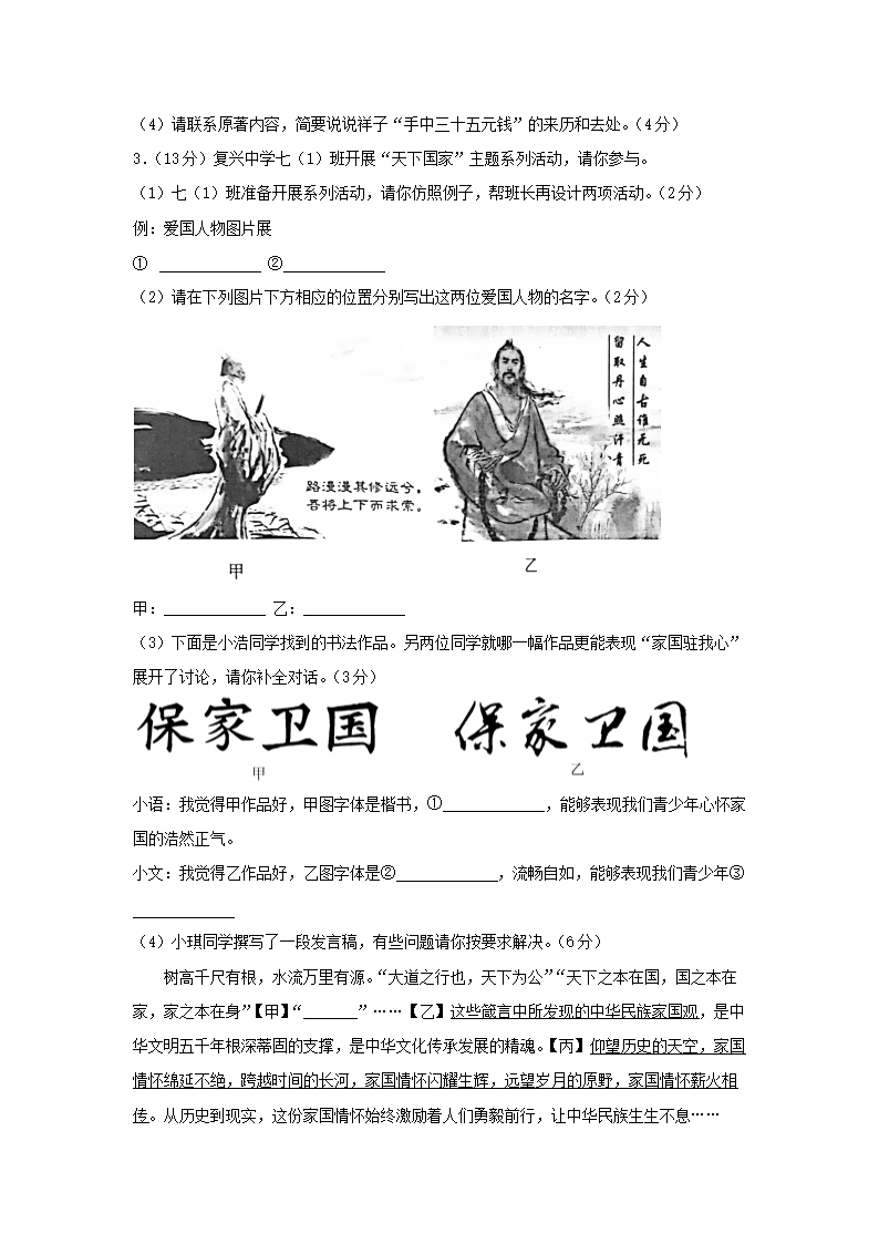 - 2021-2022學(xué)年安徽合肥廬陽區(qū)七年級下冊語文期中試卷及答案