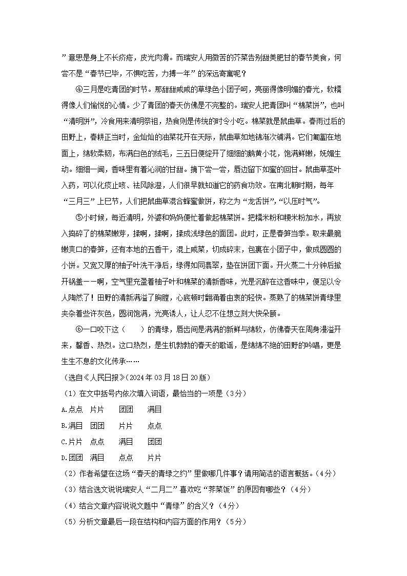- 2023-2024學(xué)年安徽合肥七年級下冊語文期中試卷及答案