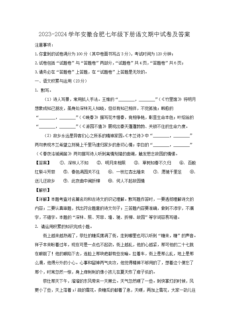 2023-2024學(xué)年安徽合肥七年級(jí)下冊(cè)語(yǔ)文期中試卷及答案(Word版)