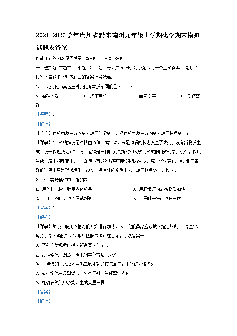 時間:2025-04-15 12:09:00 來源:無憂考網(wǎng) [字體:小 中 大]【文檔名稱】 2021-2022學(xué)年貴州省黔東南州九年級上學(xué)期化學(xué)期末模擬試題及答案(Word版).doc