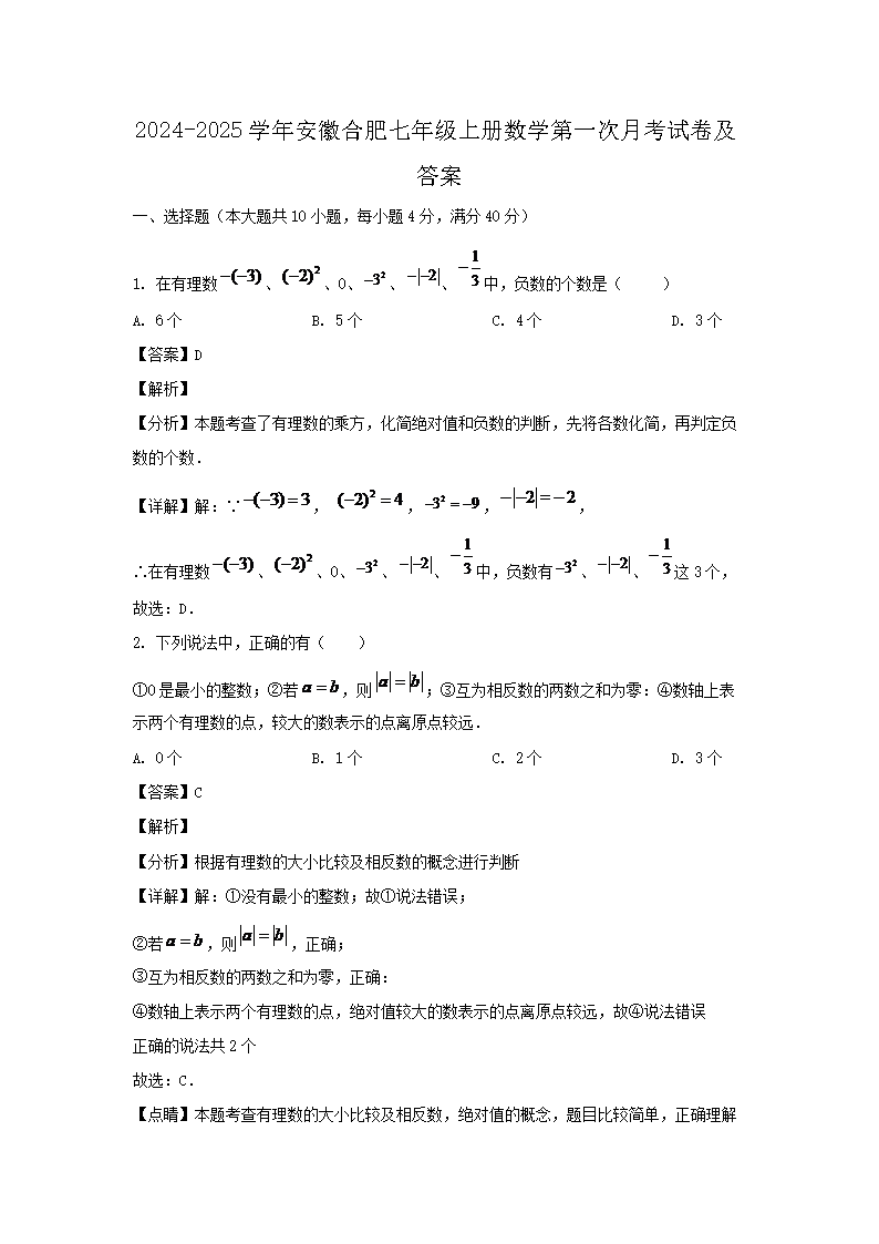 2024-2025學(xué)年安徽合肥七年級上冊數(shù)學(xué)第一次月考試卷及答案(Word版)